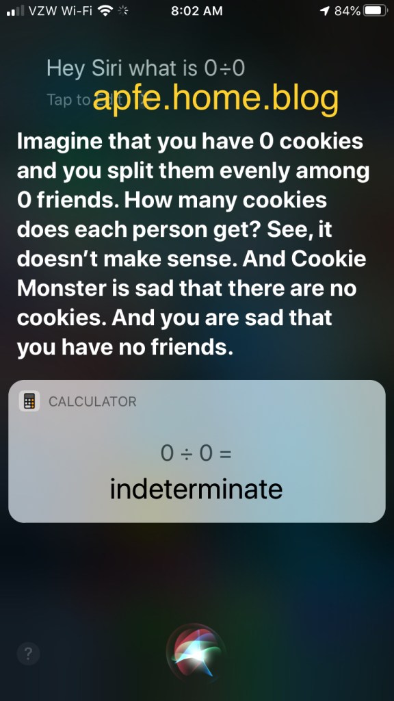 During a webcast this morning, I heard about this. This is a screenshot from my phone. Ask Siri what 0 divided by 0 is.